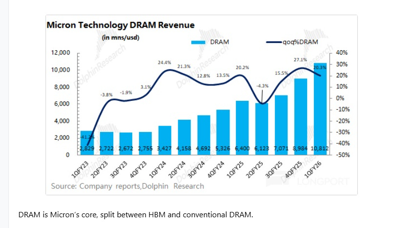 The chart above highlights this shift clearly. DRAM revenue has inflected meaningfully over the past several quarters, with sequential growth accelerating alongside improving pricing. Importantly, this isn’t a generic memory rebound. AI-driven demand, particularly from HBM and advanced DRAM tied to data centre workloads, is now a material contributor to revenue growth, lifting both volumes and margins compared to prior cycles.